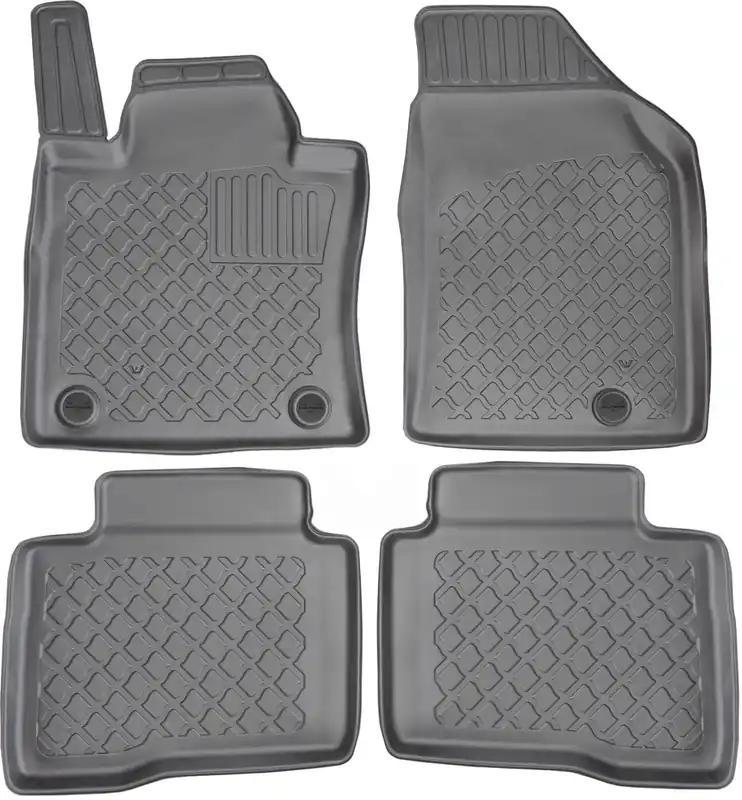 Wykonane są z czarnej, wysokogatunkowej gumy o podwyższonej odporności na ścieranie. Posiadają estetyczny rant oraz gęstą kratkę, które zapobiegają przedostawaniu się zabrudzeń na tapicerkę samochodu. Dodatkowo dywanik kierowcy posiada specjalne wzmocnienia pod pedał gazu.