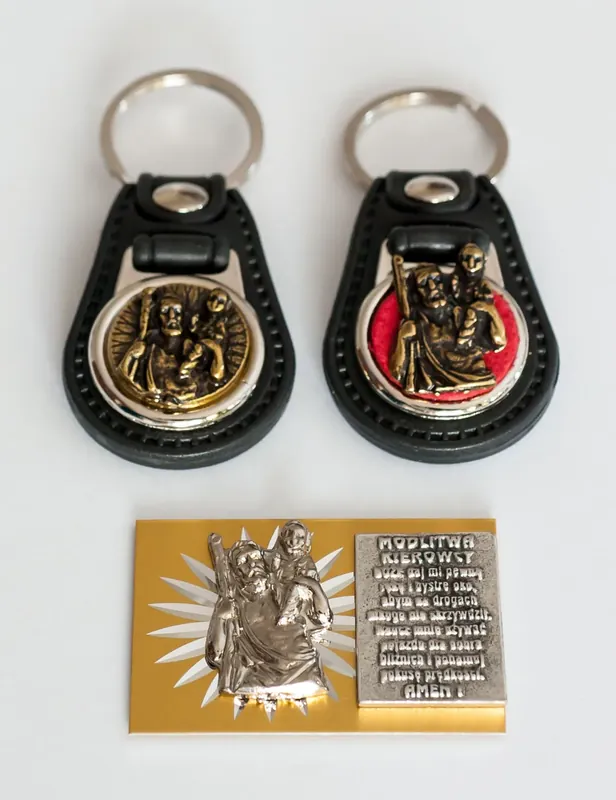 -metalowa plakietka (emblemat) do samochodu z wizerunkiem św. Krzysztofa i modlitwą kierowcy,