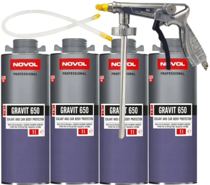 NOVOL GRAVIT 650 MASA USZCZELNIAJĄCA I ŚRODEK OCHRONY KAROSERII 2W1 SZARY 4L (1L+1L+1L+1L) + PISTOLET NOVOL UBS DO KONSERWACJI