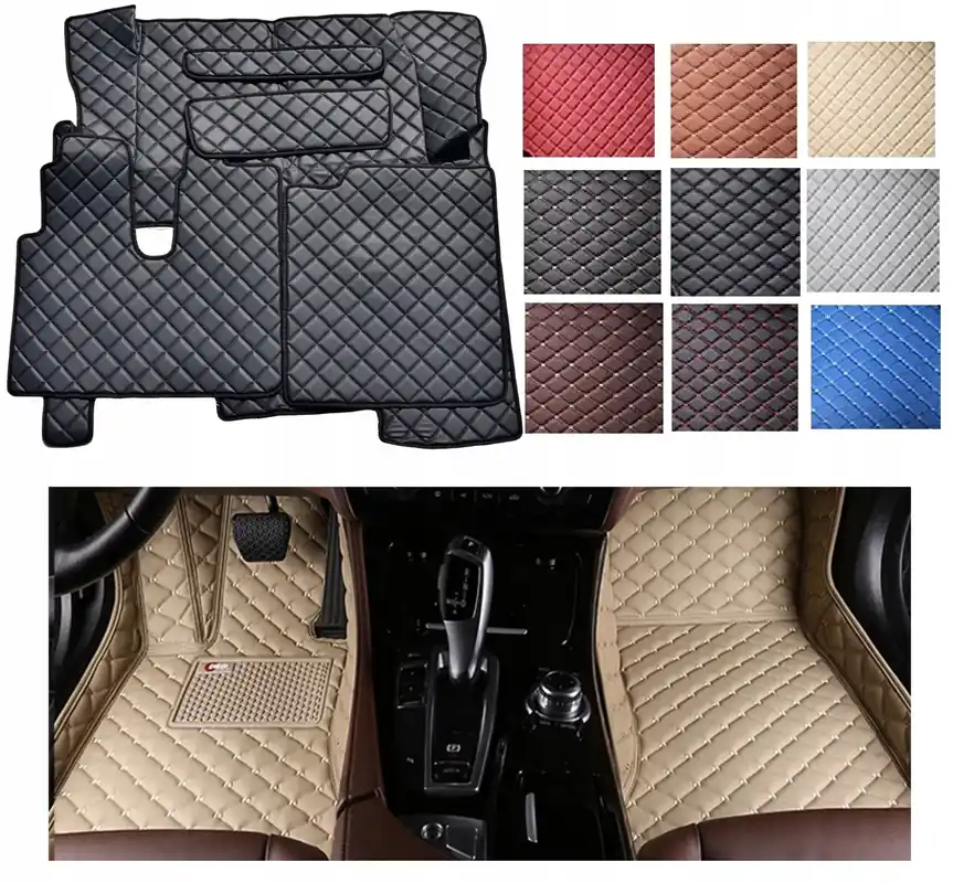 Skórzane pikowane dywaniki są dostępne w różnych kolorach, co pozwala na dopasowanie ich do wnętrza samochodu.