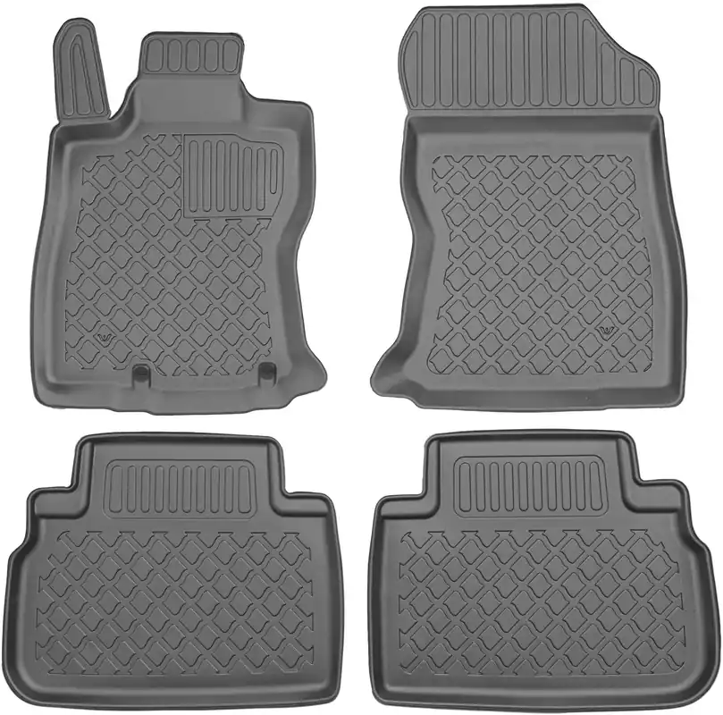 Oferowane dywaniki zostały precyzyjnie zaprojektowane do kształtu płyty podłogowej biorąc pod uwagę nie tylko markę / model samochodu, ale także rocznik oraz wersję nadwozia, dzięki czemu pasują idealnie. Dywaniki wytwarzane są z najwyższej jakości, trwałego i wzmocnionego tworzywa sztucznego, niezawierającego substancji szkodliwych dla zdrowia, co zapewnia bezpieczeństwo użytkowania. Wysoki kołnierz(brzeg) ochronny dookoła dywaników oraz stabilność kształtu skutecznie zatrzymuje wodę i brud, zabezpieczając oryginalną tapicerkę samochodową przed zabrudzeniem. Bezpieczne w użytkowaniu, dzięki praktycznemu i łatwemu w użyciu systemowi mocowania do podłogi samochodu. System mocowania dostosowany jest do marki / modelu samochodu i zabezpiecza dywanik przed przesuwaniem podczas jazdy. Matowe wykończenie oraz dopracowany wzór na powierzchni zapewniają estetyczny wygląd dywaników w samochodzie.