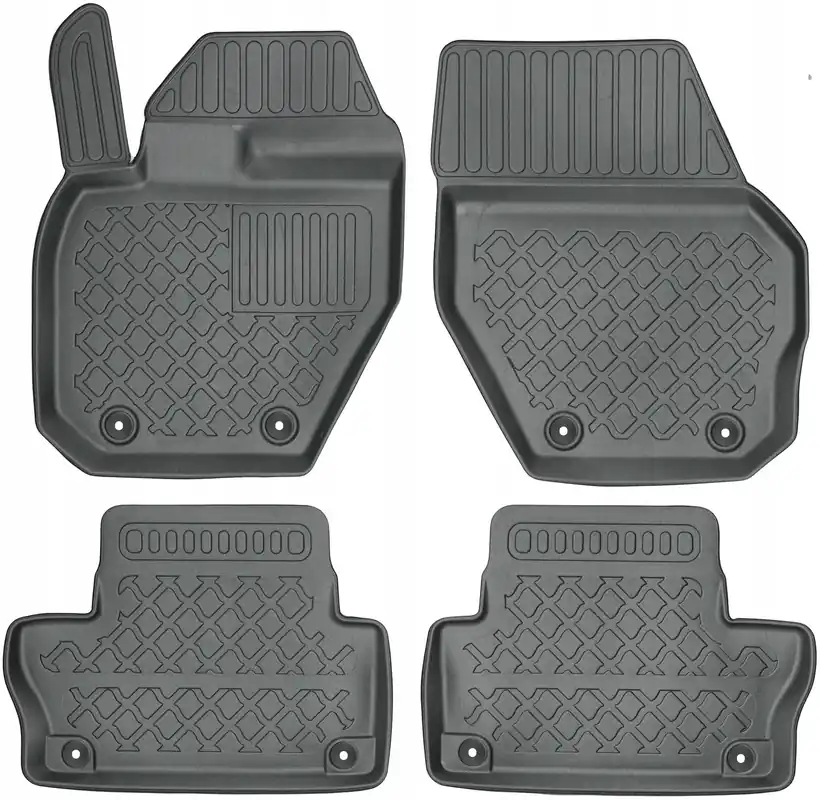 Oferowane dywaniki zostały precyzyjnie zaprojektowane do kształtu płyty podłogowej biorąc pod uwagę nie tylko markę / model samochodu, ale także rocznik oraz wersję nadwozia, dzięki czemu pasują idealnie. Dywaniki wytwarzane są z najwyższej jakości, trwałego i wzmocnionego tworzywa sztucznego, niezawierającego substancji szkodliwych dla zdrowia, co zapewnia bezpieczeństwo użytkowania. Wysoki kołnierz(brzeg) ochronny dookoła dywaników oraz stabilność kształtu skutecznie zatrzymuje wodę i brud, zabezpieczając oryginalną tapicerkę samochodową przed zabrudzeniem. Bezpieczne w użytkowaniu, dzięki praktycznemu i łatwemu w użyciu systemowi mocowania do podłogi samochodu. System mocowania dostosowany jest do marki / modelu samochodu i zabezpiecza dywanik przed przesuwaniem podczas jazdy. Matowe wykończenie oraz dopracowany wzór na powierzchni zapewniają estetyczny wygląd dywaników w samochodzie.