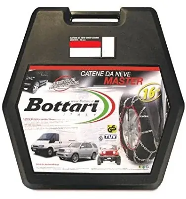 Para łańcuchów śniegowych do pojazdów terenowych i 4×4, bardzo mocne ogniwa 16 mm Podwyższony drut 4,3 mm do opon o dużej wytrzymałości. Zewnętrzny hak z blokadą łańcucha i wzmocnionym gumą prętem do ciągnięcia. Bieżnik z rombem z hartowanej stali Krótkie ogniwa łańcucha o przekroju „D”, do użytku z obu stron. Elastyczna linka wewnętrzna ułatwiająca montaż. W zestawie rękawice ochronne i ogniwa naprawcze.